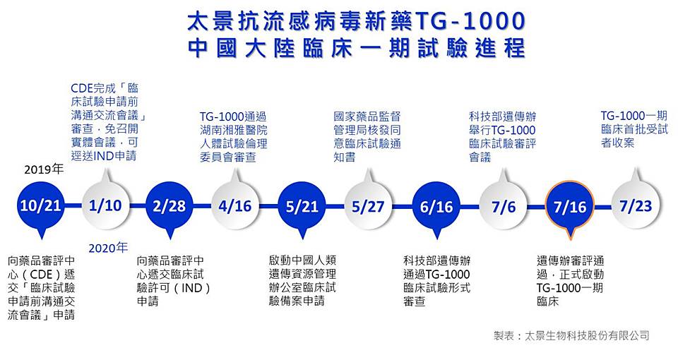 (2020年7月23日台北訊)太景流感新藥TG-1000於上周啟動中國大陸第一期臨床試驗後,正式於今日完成首批受試者給藥,此項試驗預計招收66名受試者。