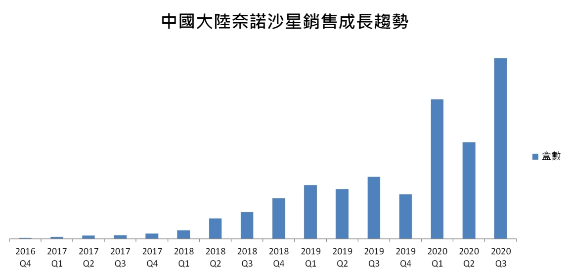 從單一市場分析,奈諾沙星今年元月進入中國大陸醫保目錄後,第三季銷售盒數較去年同期增加191.4%,創下上市以來新高紀錄,累計前三季則成長151.8%。台灣的銷售也在穩定成長中,單季醫院採購量有27.9%的增長,前三季則成長27.8%。在肺炎病例較少的夏季,抗生素用量相對較少,但從奈諾沙星逆勢成長的銷售數量可看出其市場正顯著擴增。