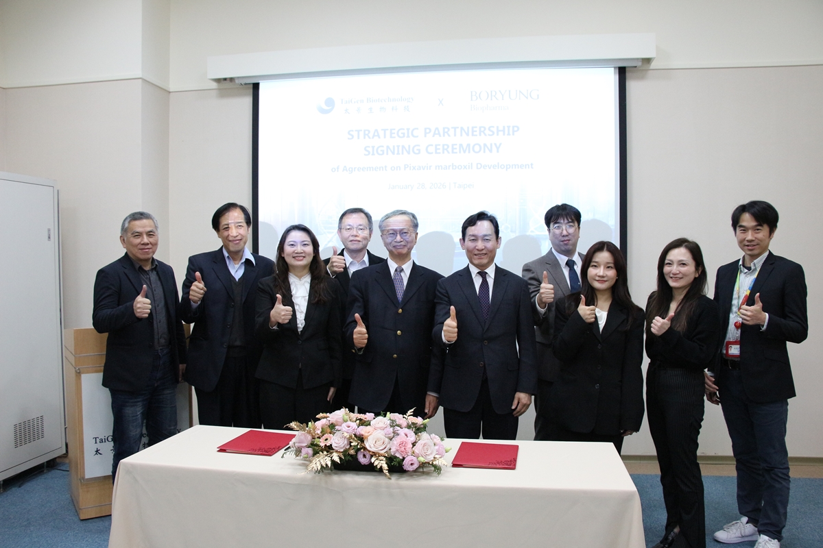 (2026年1月29日台北訊)太景*-KY(4157)與韓國Boryung Biopharma於昨(28)日假台北正式舉行流感抗病毒新藥Pixavir marboxil (TG-1000)授權合約簽約儀式。